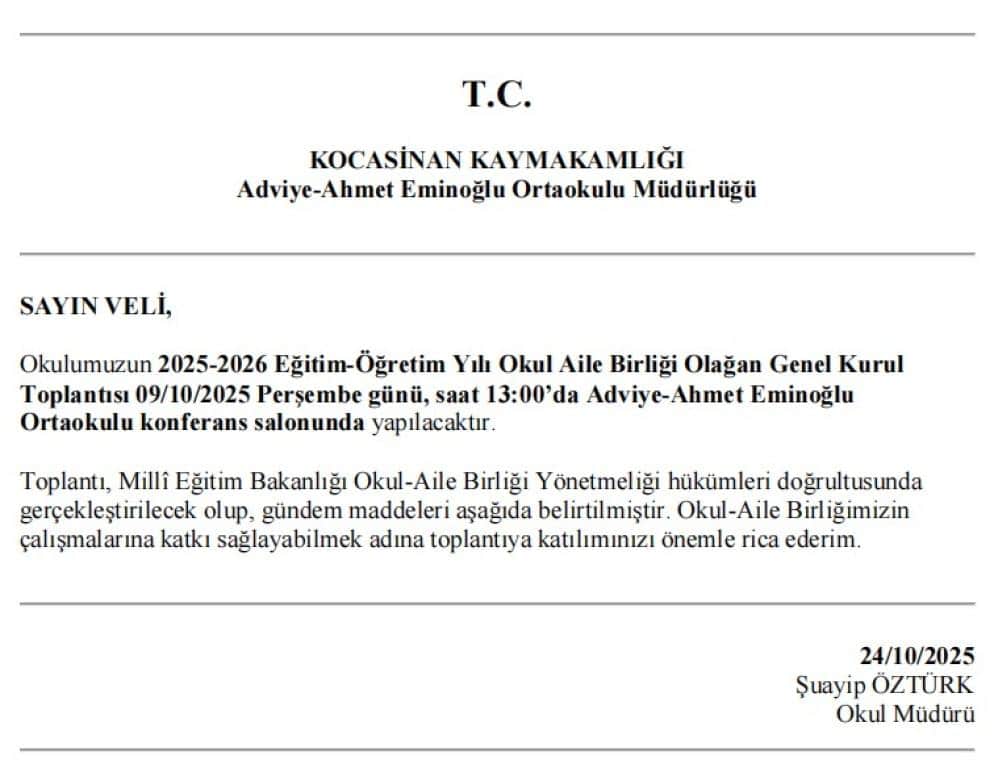 Değerli Velilerimiz; 2025-2026 Eğitim-Öğretim Yılı 1. Dönem Okul Aile Birliği Toplantımız, 09/10/2025 Perşembe günü saat 13.00’da öğrencilerimizin ve okulumuzun genel durumlarını görüşmek amacıyla Adviye-Ahmet Eminoğlu İlkokulu-Ortaokulu toplantı salonunda yapılacaktır. Okul Aile Birliğimizin çalışmalarına destek olabilmek için toplantıya katılmanız hususunda; Gereğini bilgilerinize rica ederim.